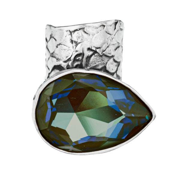 Pierścionek z kolekcji Biały Łabędź wykonany jest ręcznie ze srebra oksydowanego, próby 925. Wykończenie srebra to antyczne srebro. Kryształ Swarovskiego jest o wymiarach ok. 2 x 3 cm. Szerokość szyny jest od ok. 1 – 1,8 cm. Pierścionek posiada regulację do 1-2 rozmiarów.