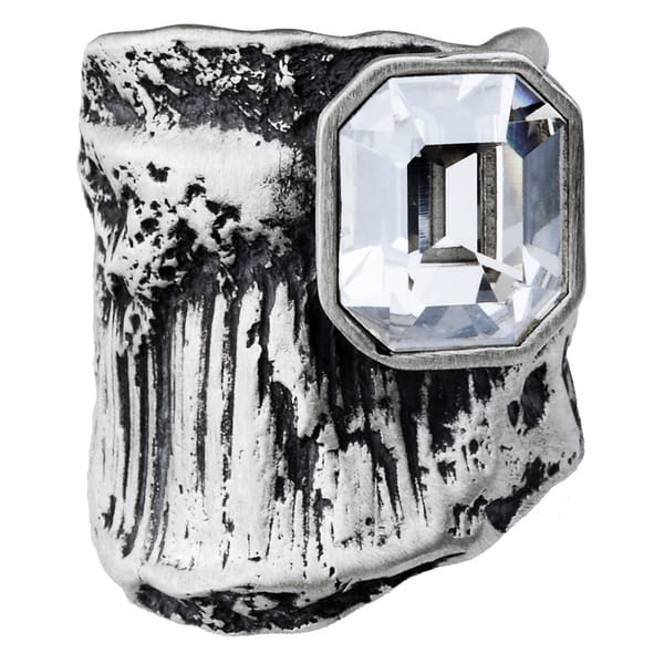 Kolekcja - Selene Pierścionek ze srebra, rodowany próby 925 wykonany ręcznie. Wykończenie: czarny rod 24 k grafitowy blask. Kryształ Swarovskiego w kolorze Crystal Silver Shade. Wielkość szyny wynosi ok. 2,5cm. Wielkość kryształu wynosi ok. 1,5cm/1cm. Pierścionek dostępny w rozmiarach 9-21. Każdy produkt posiada gwarancję marki w postaci srebrnego logo Motyle