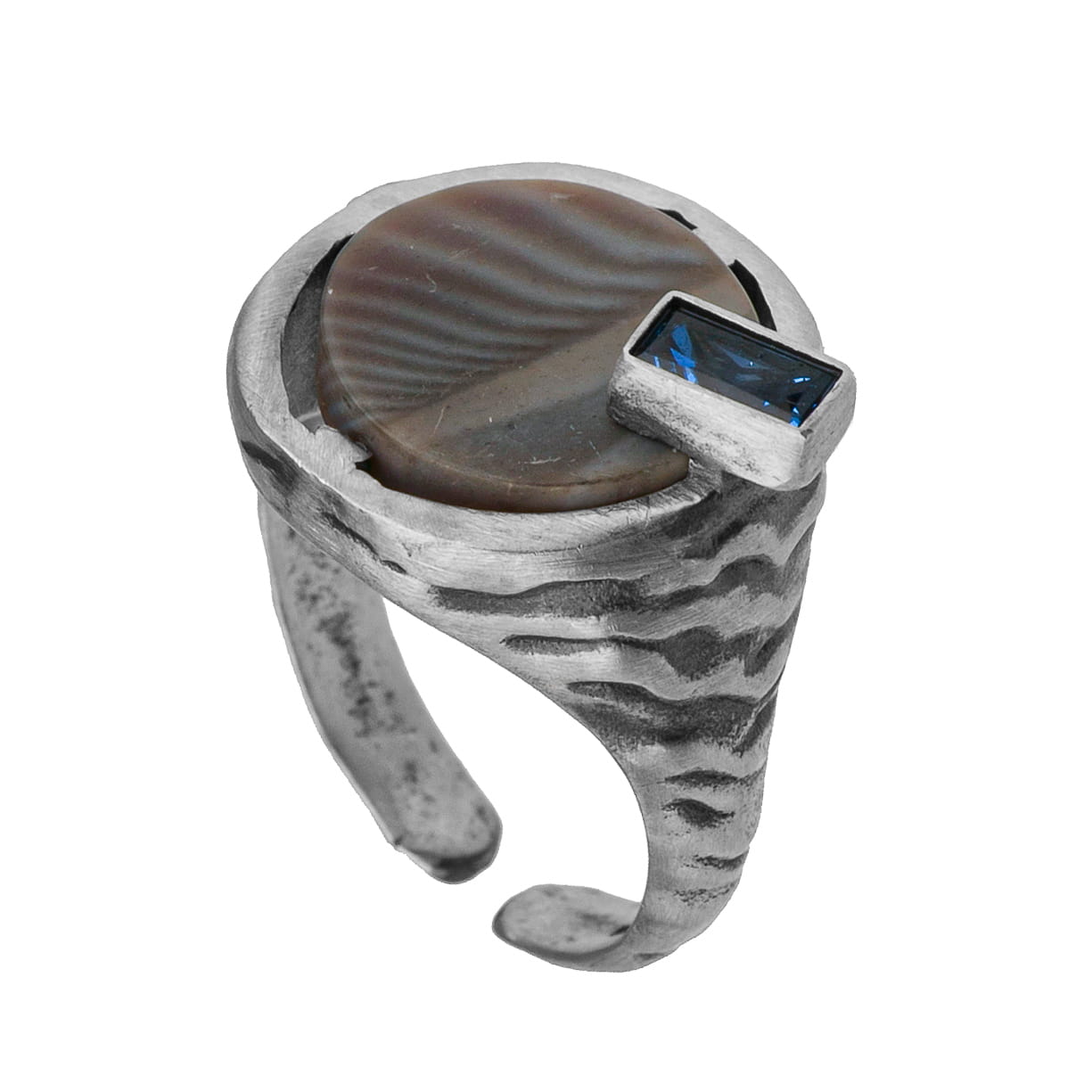 Pierścionek z kolekcji Diuna wykonany ręcznie ze srebra oksydowanego próby 925. Wykończenie srebra to „antyczne srebro”. Kamień naturalny to krzemień pasiasty o średnicy 1,4 cm. Nanokryształ jest w kolorze Aquamarine o wymiarach 3 x 6 mm. Regulacja szyny jest do 1,5 rozmiaru.
