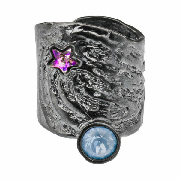 Pierścionek ze srebra rodowanego próby 925, wykonany jest ręcznie. Wykończenie srebra to 24K grafitowy blask. Szyna nieregularna otwarta regulowana w najszerszym punkcie ma 2 cm. Średnica kryształu kółko w kolorze Sky Ignit oraz średnica kryształu gwiazdka w kolorze Vitrail Light wynosi 0,5cm.