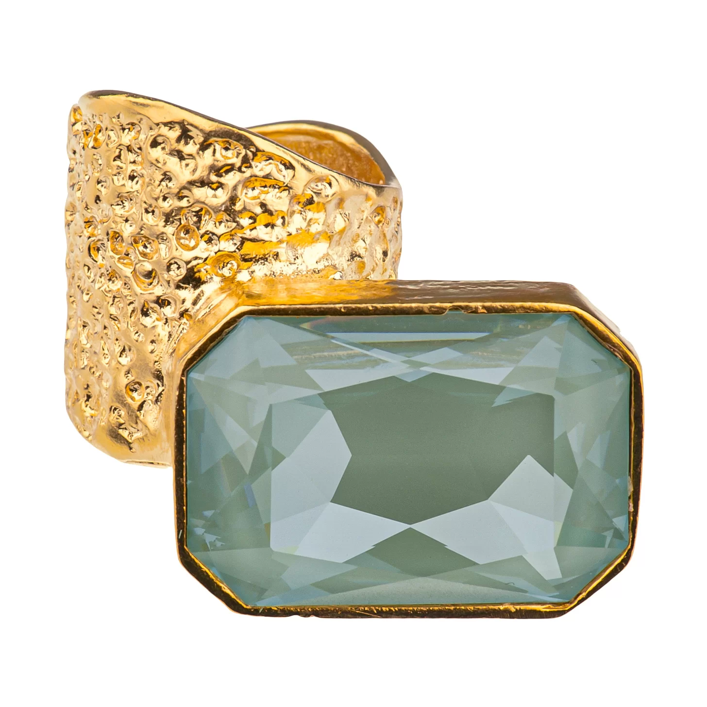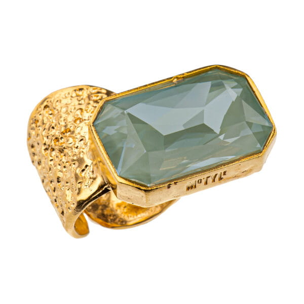 Pierścionek z kolekcji Wyspa Skarbów wykonany jest ręcznie ze srebra pozłacanego próby 925. Wykończenie srebra to królewskie złoto 24K. Kamień to kryształ w kolorze Agave o wymiarach 3×2 cm. Regulacja szyny jest do 1,5 rozmiaru. Rozmiar zamawianego pierścionka prosimy wpisać w „uwagach do zamówienia”