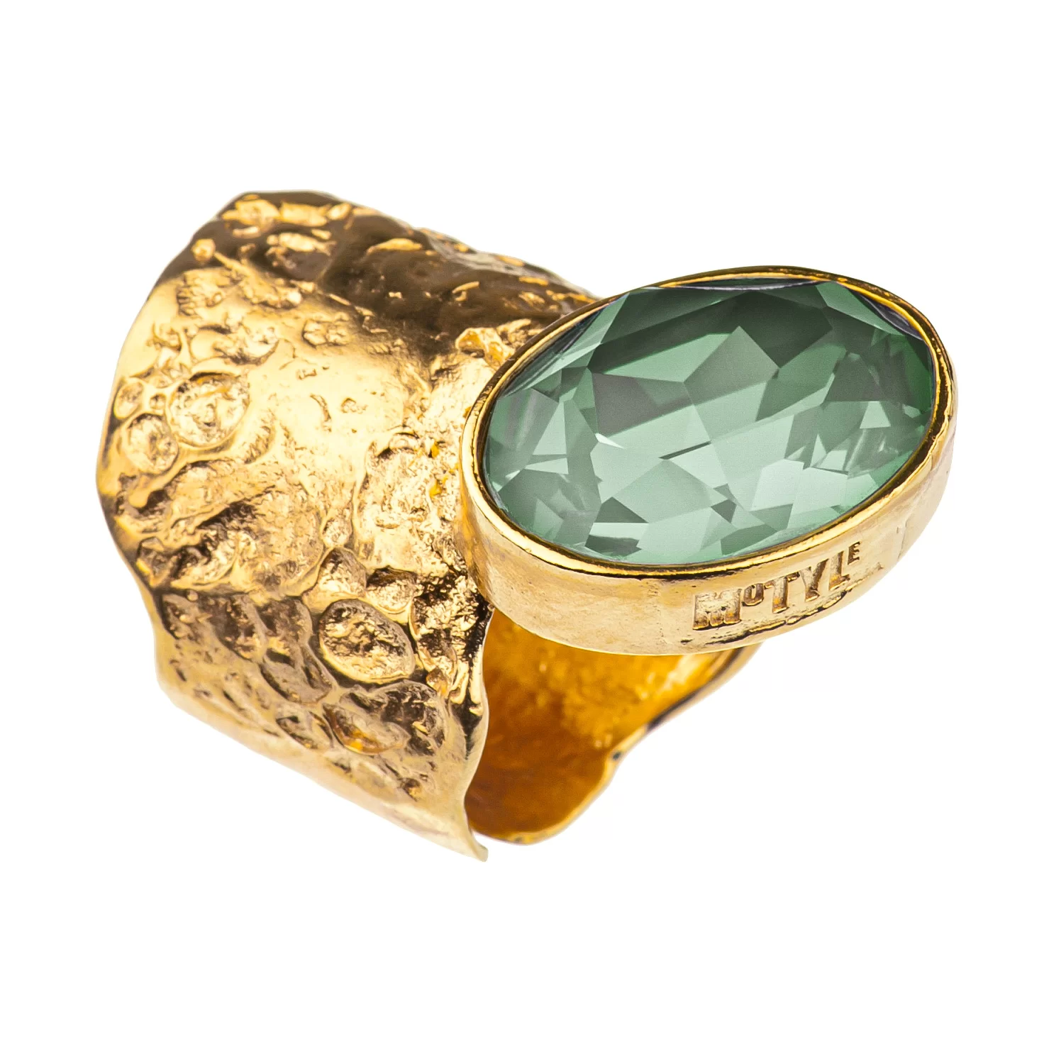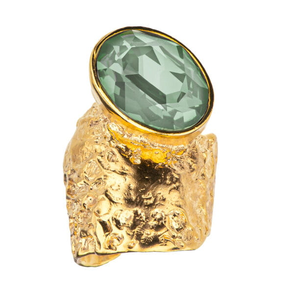 Pierścionek z kolekcji Wyspa Skarbów wykonany jest ręcznie ze srebra pozłacanego próby 925. Wykończenie srebra to królewskie złoto 24K. Kamień to kryształ w kolorze Agave o wymiarach 2×1 cm. Regulacja szyny jest do 1,5 rozmiaru. Rozmiar zamawianego pierścionka prosimy wpisać w „uwagach do zamówienia”.