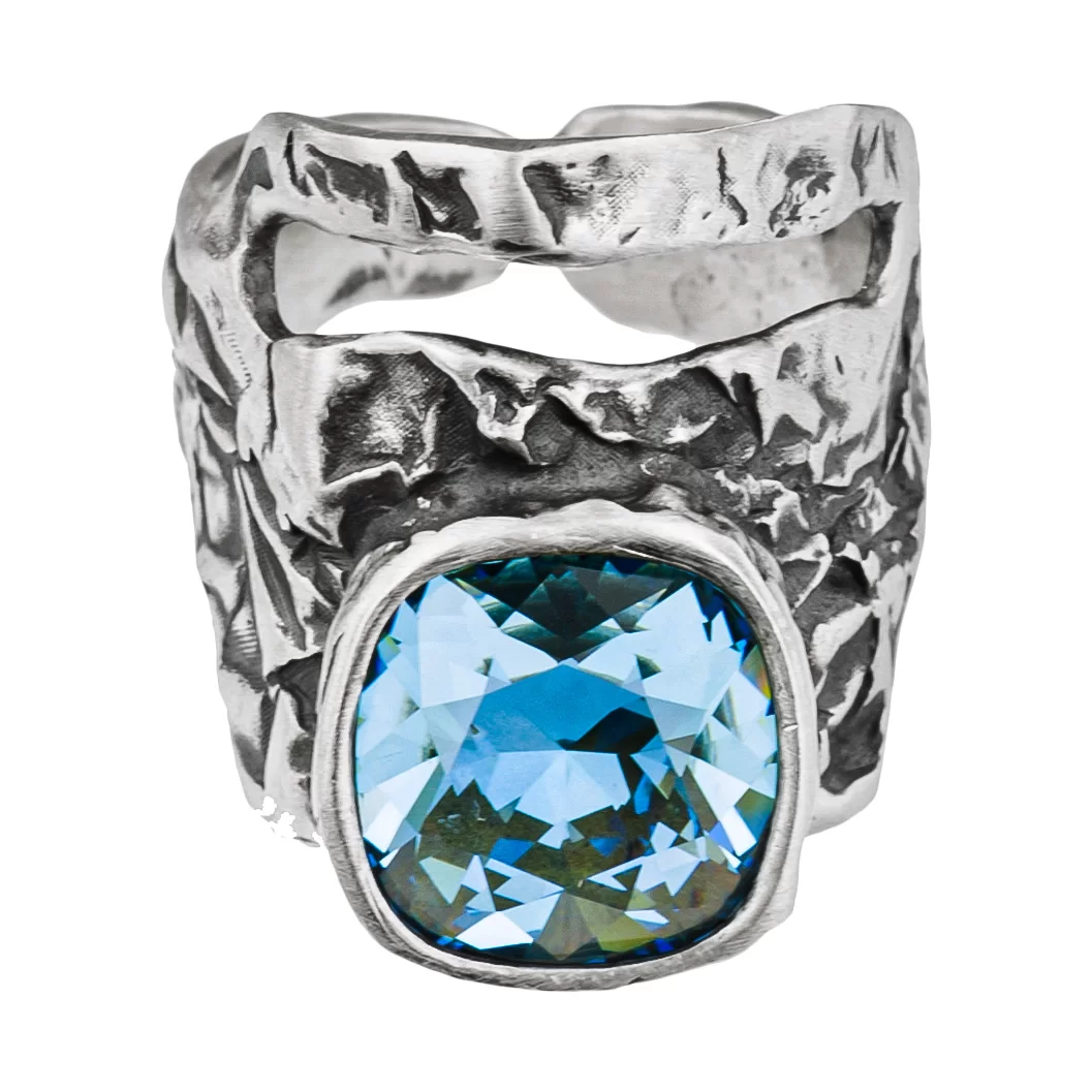 Pierścionek z kolekcji Wyspa Skarbów wykonany ręcznie srebra oksydowanego próby 925. Wykończenie srebra to antyczne srebro. Kamień to kryształ w kolorze Aquamarine o wymiarach 1,3 x 1,3 cm. Regulacja szyny jest do 1,5 rozmiaru. Rozmiar zamawianego pierścionka prosimy wpisać w „uwagach do zamówienia”.