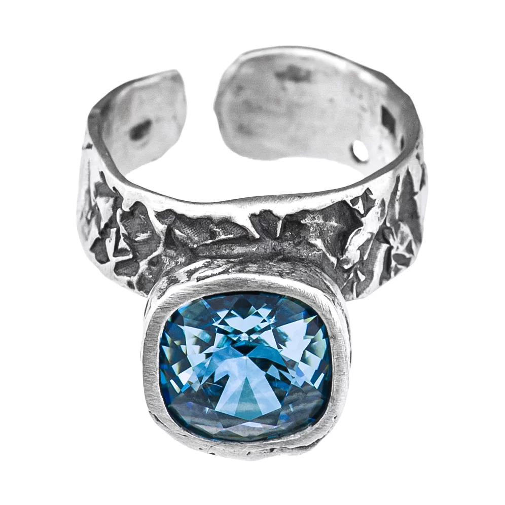 Pierścionek z kolekcji Wyspa Skarbów wykonany jest ręcznie ze srebra oksydowanego próby 925. Wykończenie srebra to antyczne srebro. Kamień to kryształ w kolorze Aquamarine o wymiarach 1 x 1 cm. Szerokość szyny to ok. 0,6 cm. Regulacja szyny jest do 1,5 rozmiaru. Rozmiar zamawianego pierścionka prosimy wpisać w „uwagach do zamówienia”
