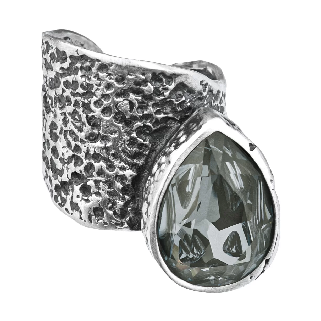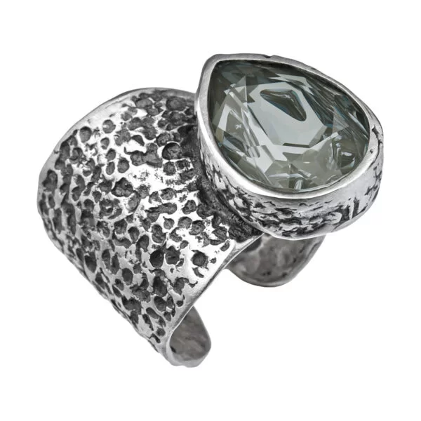 Pierścionek z kolekcji Wyspa Skarbów wykonany jest ze srebra oksydowanego próby 925. Wykończenie srebra to antyczne srebro. Kamień to kryształ w kolorze Dark Grey o wymiarach 2×1,5 cm. Regulacja szyny jest do 1,5 rozmiaru. Rozmiar zamawianego pierścionka prosimy wpisać w „uwagach do zamówienia”.