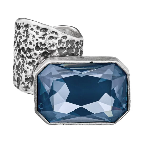 Pierścionek z kolekcji Wyspa Skarbów wykonany jest ręcznie ze srebra oksydowanego, próby 925. Wykończenie srebra to antyczne srebro. Kamień jest to kryształ Swarovskiego w kolorze Denim o wymiarach 3×2 cm. Regulacja szyny jest do 1,5 rozmiaru.