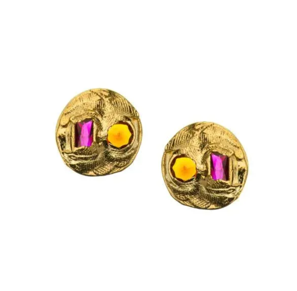 Kolczyki srebrne, złocone próby 925 wykonane ręcznie Wykończenie srebra: „królewskie złoto 24K” Kamienie: nanokryształy w kolorach Ruby dark, Citrine Średnica kolczyków wynosi około 1,5 cm Zapięcie: sztyft