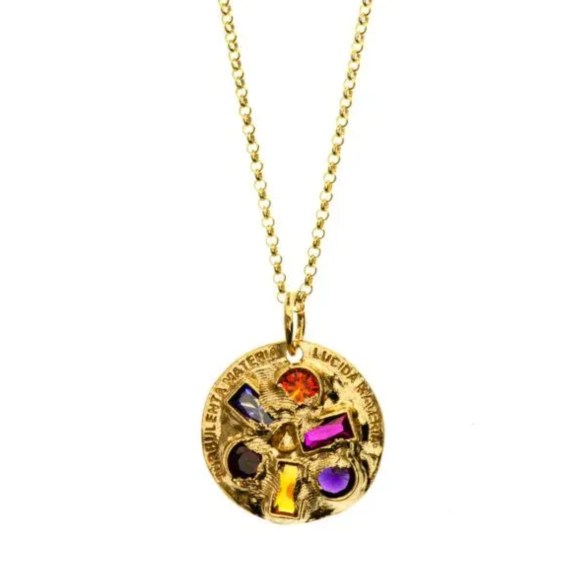 Artystyczny naszyjnik wykonany ręcznie w autorskiej pracowni biżuterii Motyle. Wyjątkowa zawieszka wykonana ze srebra w połączeniu z nanokryształami łączy w sobie inspirację naturą wraz z autorskimi technikami mocowania kamieni. Na srebrnej blaszce wygrawerowane są dwie sentencje w języku łacińskim: „Lucida materia” – świetlista materia, „Turbulenta materia” – turbulentna materia.
