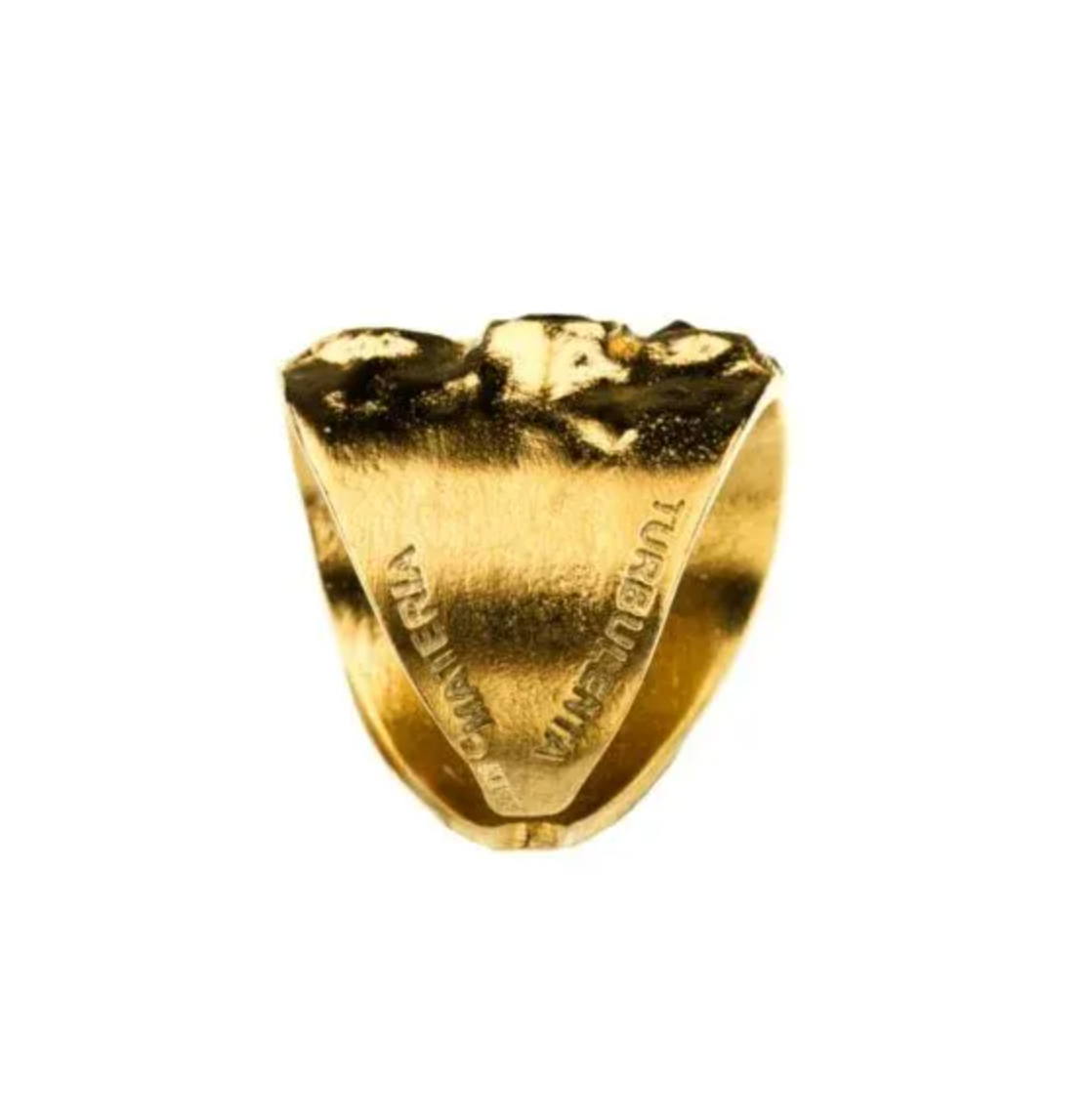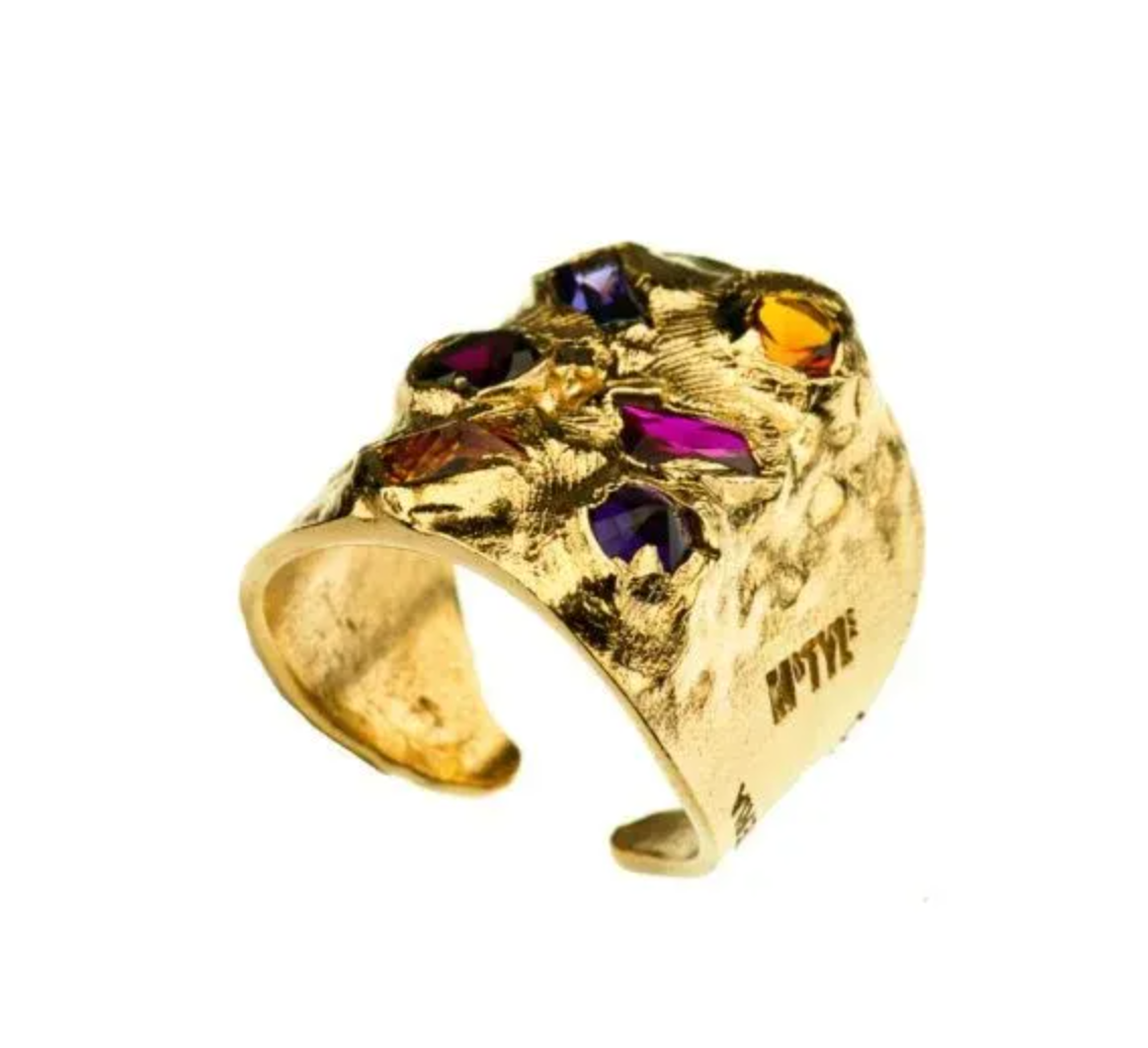Pierścionek srebrny – pozłacany próby 925 wykonany ręcznie Wykończenie srebra: „królewskie złoto 24K” Kamienie: nanokryształy w kolorach Amethyst, Ruby dark, Citrine Szerokość szyny pierścionka wynosi 2 cm Dostępne rozmiary: 10 – 23