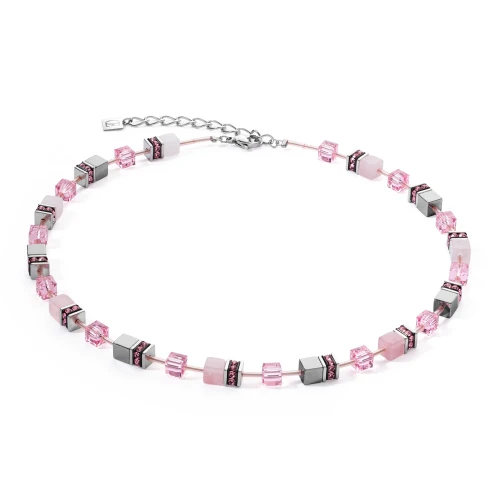 Naszyjnik wykonany jest z kamieni naturalnych takich jak kwarc różowy, kryształów i szkła. Stal szlachetna jest w kolorze srebra. Jego długość to 42 cm + 6 cm przedłużka.