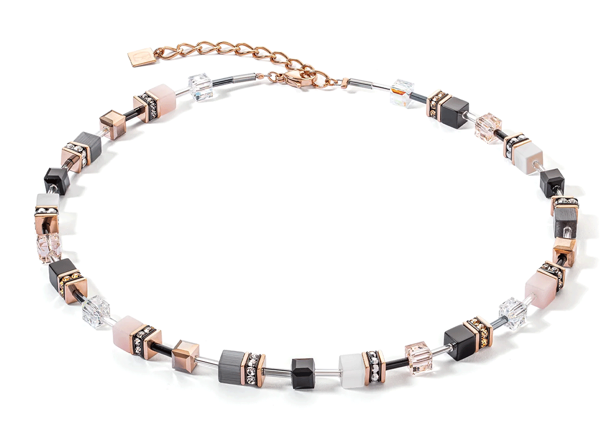 Naszyjnik wykonany jest z kamieni naturalnych takich jak: tygrysie oko, kryształów oraz szkła. Stal szlachetna jest w kolorze różowego złota. Jego długość to 42 cm + 6 cm przedłużka.