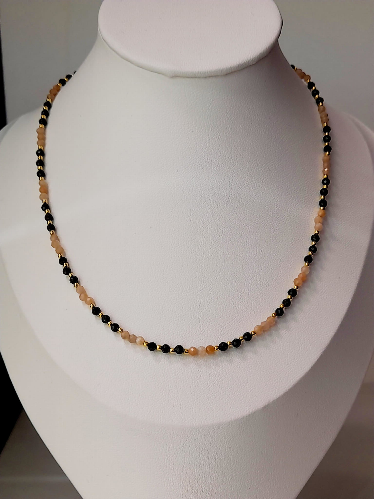 Naszyjnik wykonany jest ręcznie z połączenia srebra pozłacanego 24 karatowym złotem oraz turmalinów i kamieni słonecznych.