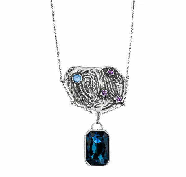 Naszyjnik srebrny dwustronny – oksydowany próby 925, wykonany jest ręcznie. Wykończenie srebra to antyczne srebro. Kryształ duży jest w kolorze Montana/ Linen o wymiarach 3cmx2cm. Średnica kryształu to kółko w kolorze Sky Ignite 0,7cm. Średnica kryształu gwiazdka w kolorze Vitail Light wynosi 0,5cm. Długość naszyjnika to 56 cm z możliwością regulacji do 45 cm. Typ zapięcia to karabińczyk.