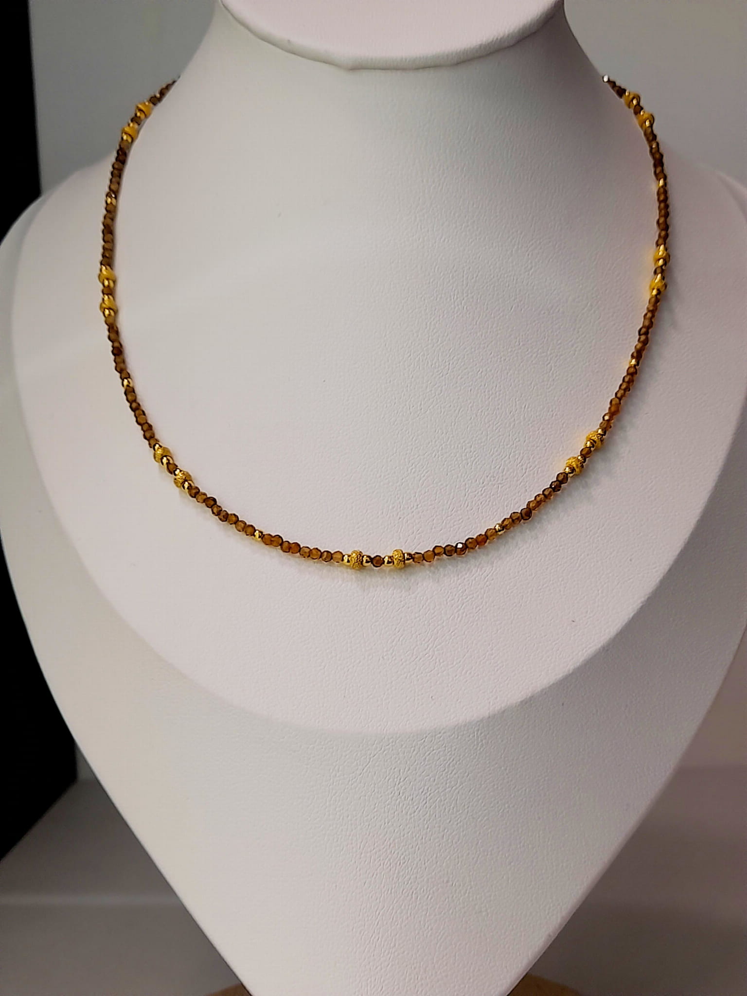 Naszyjnik wykonany jest ręcznie z połączenia srebra pozłacanego 24 karatowym złotem oraz brązowych turmalinów.