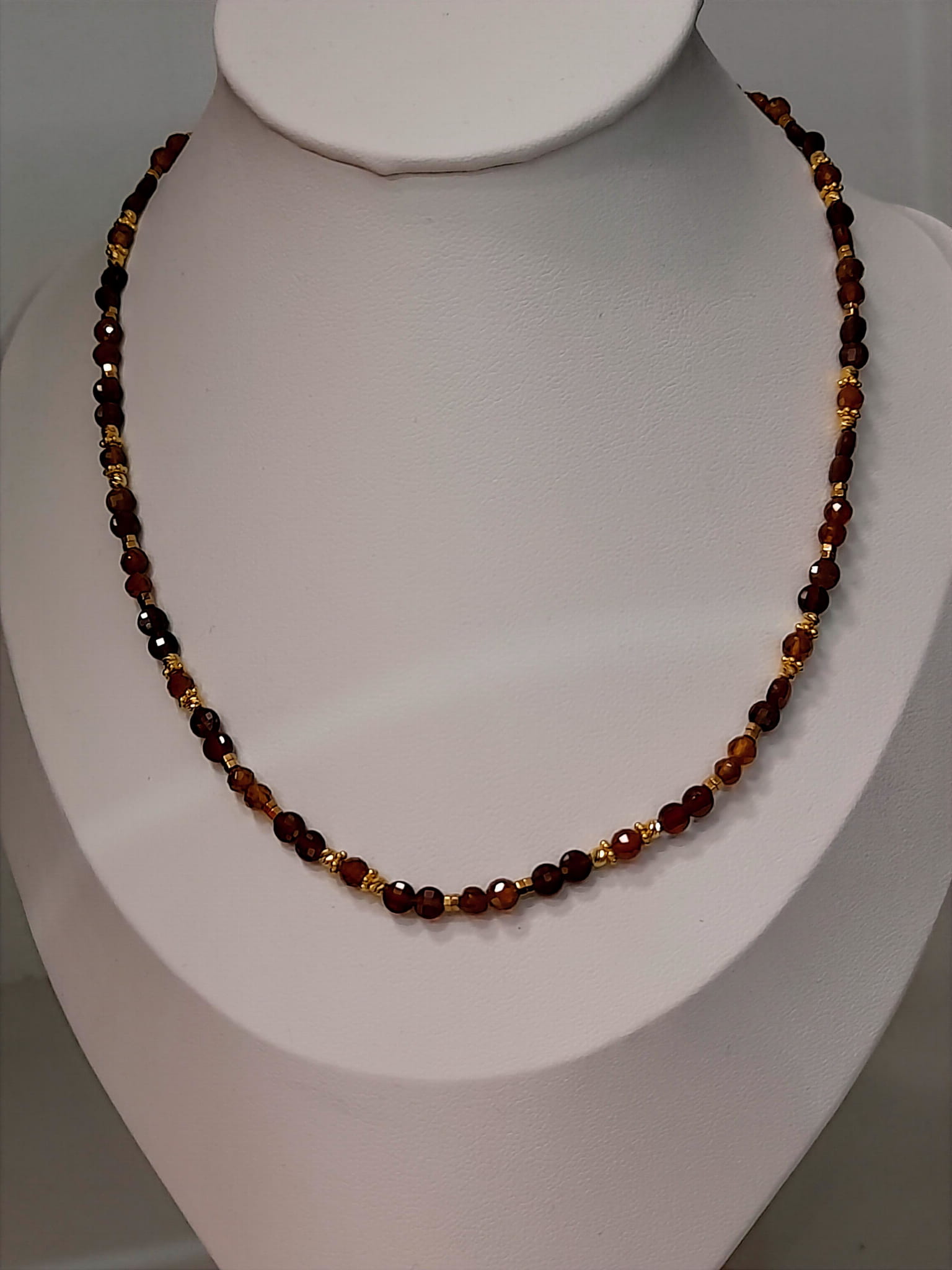Naszyjnik wykonany jest ręcznie z połączenia srebra pozłacanego 24 karatowym złotem oraz granatów.