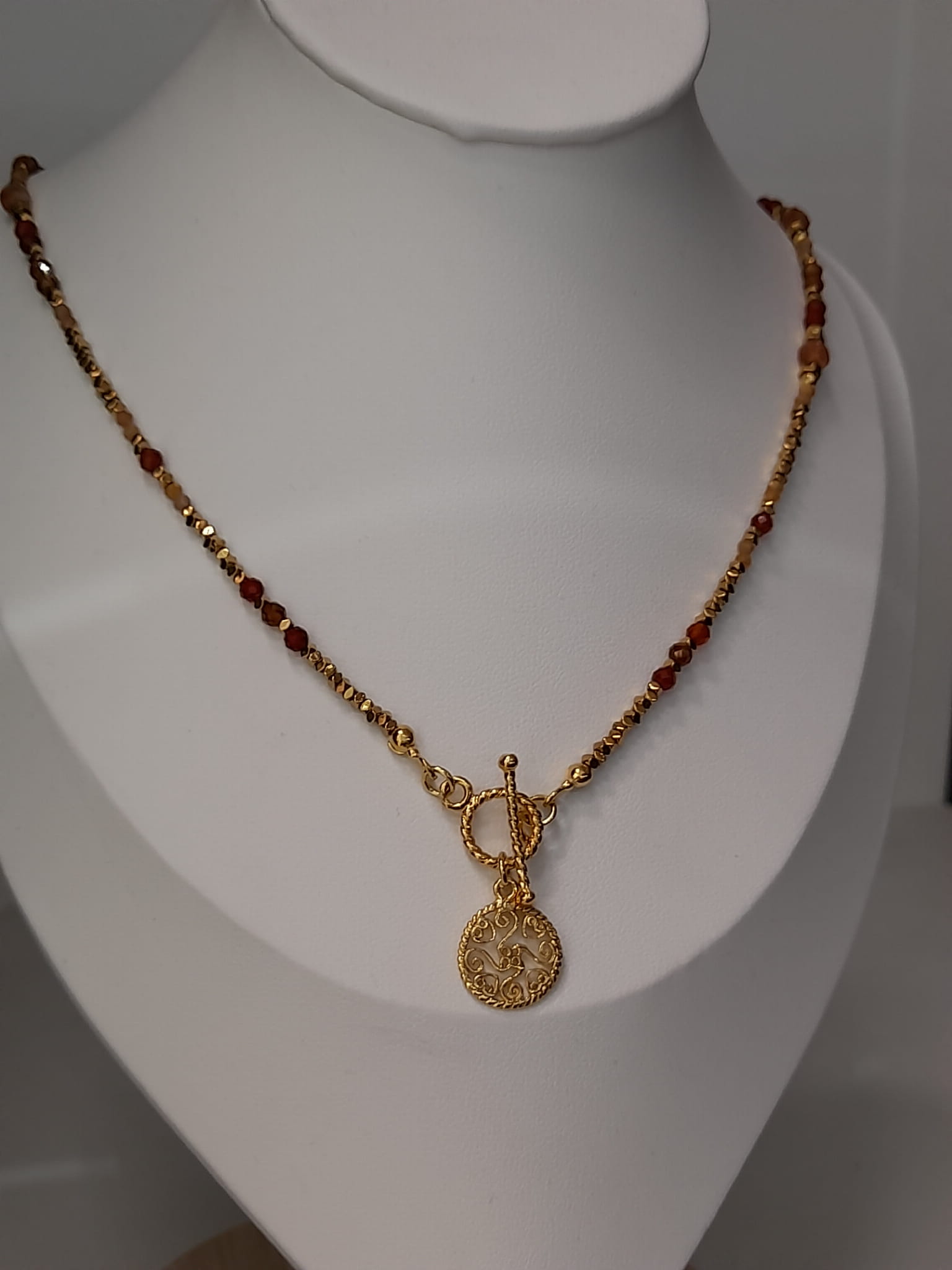 Naszyjnik wykonany jest ręcznie z połączenia srebra pozłacanego 24 karatowym złotem oraz granatów, kamieni słonecznych i karneola.