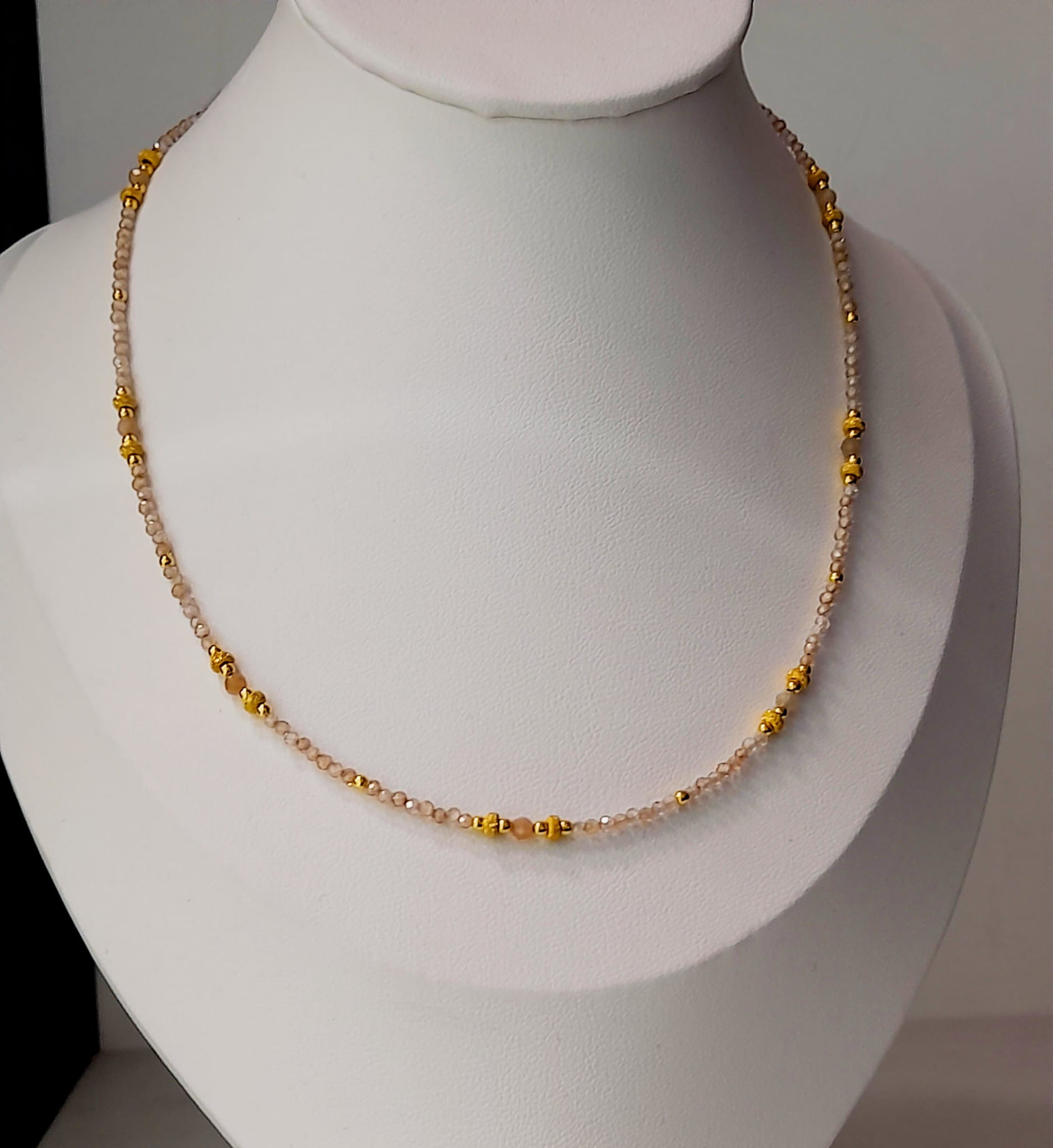 Naszyjnik wykonany jest ręcznie z połączenia srebra pozłacanego 24 karatowym złotem oraz topazów.
