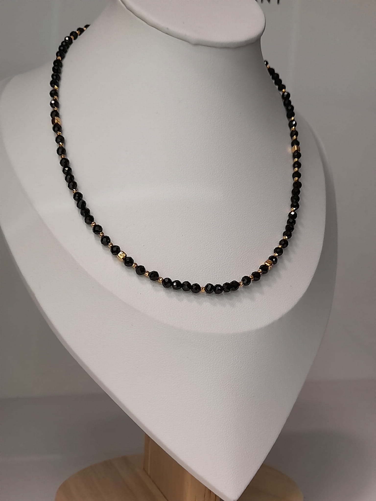 Naszyjnik wykonany jest ręcznie z połączenia srebra pozłacanego 24 karatowym złotem oraz turmalinów.
