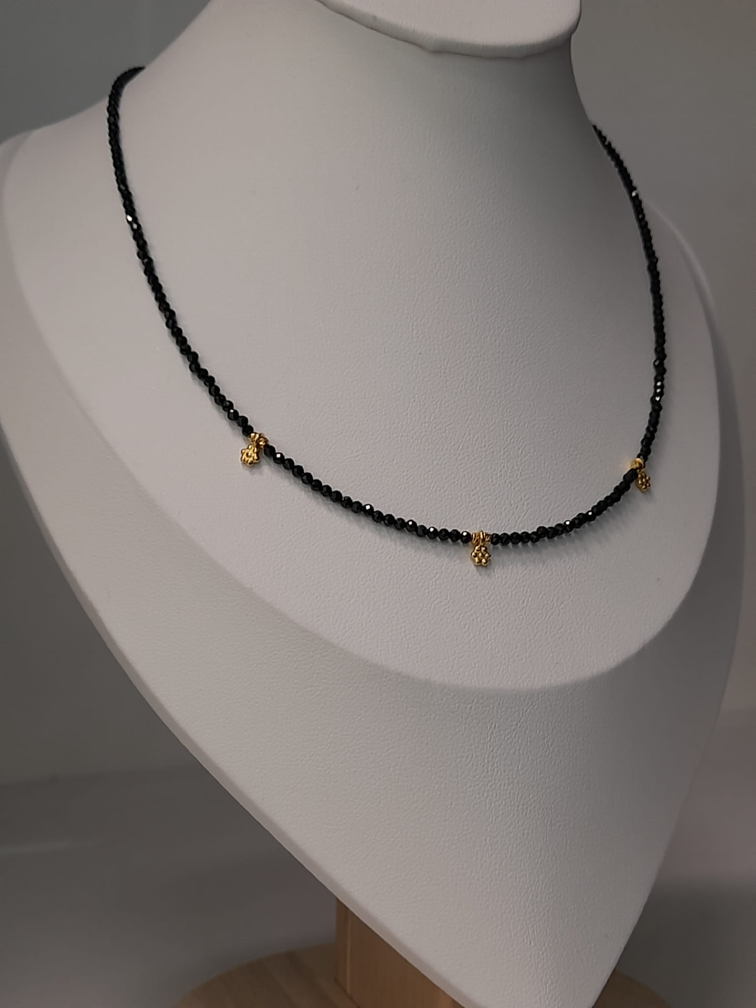 Naszyjnik wykonany jest ręcznie z połączenia srebra pozłacanego 24 karatowym złotem oraz turmalinów.