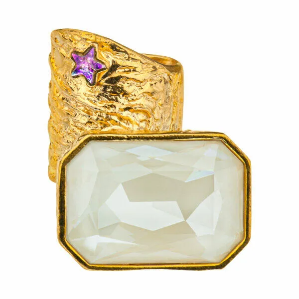 Pierścionek z kolekcji Vincent wykonany jest ręcznie ze srebra pozłacanego próby 925. Wykończenie srebra to królewskie złoto 24k. Szyna jest nieregularna otwarta regulowana w najszerszym punkcie ma 2,5 cm. Duży kryształ w kolorze Linen jest o wymiarach 3cm x 2cm, natomiast średnica kryształu gwiazdka w kolorze Vitrail Light wynosi 0,5 cm.