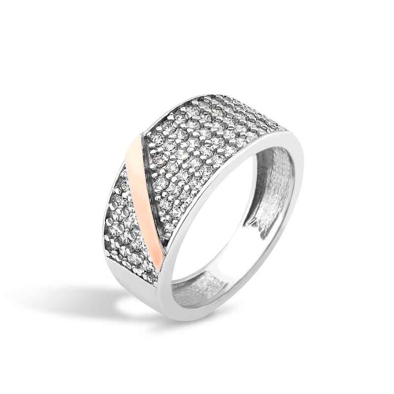 Pierścionek wykonany jest ze srebra rodowanego, płytki złota w próbie 375 oraz białych cyrkonii.