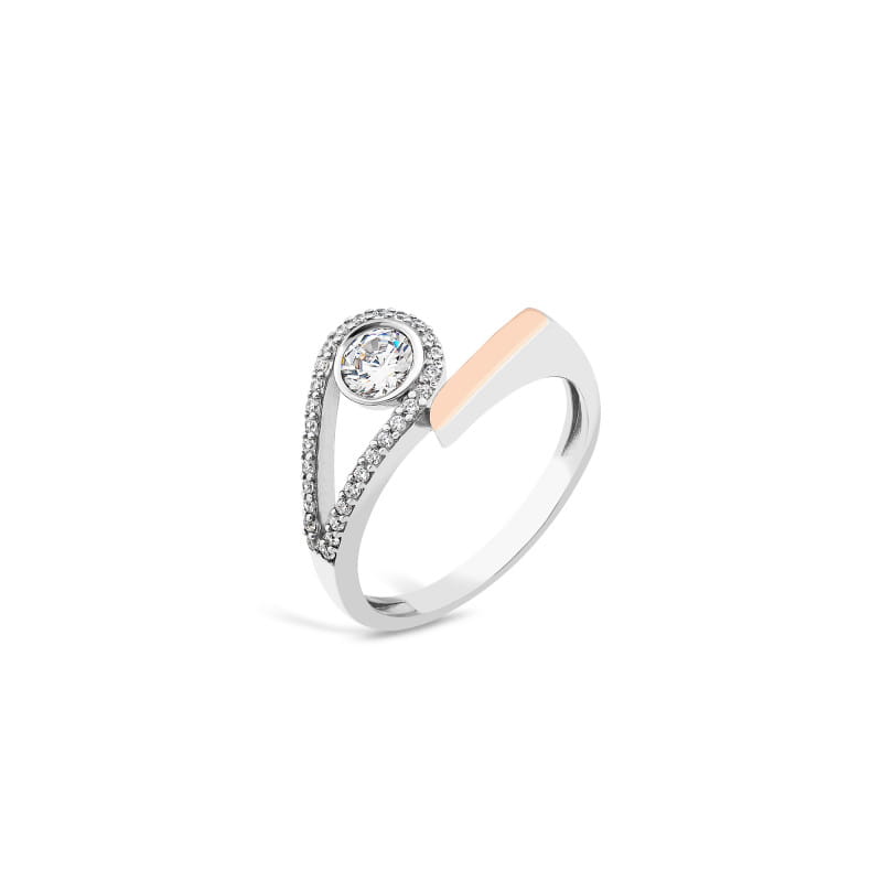Pierścionek wykonany jest ze srebra rodowanego, płytki złota w próbie 375 oraz białych cyrkonii.