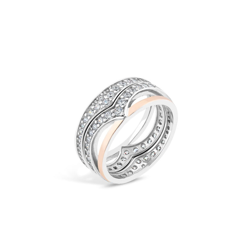 Pierścionek wykonany jest ze srebra rodowanego, płytki złota w próbie 375 oraz cyrkonii.