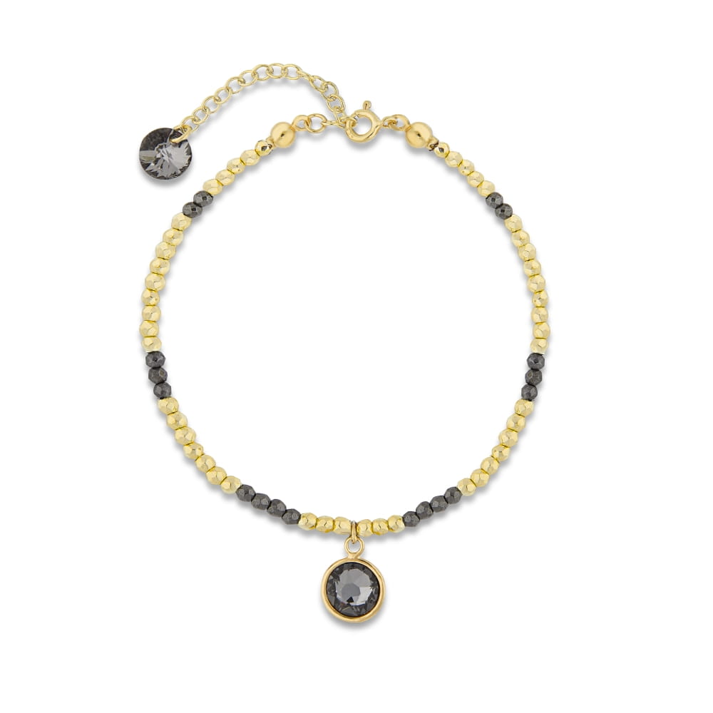 Bransoletka jest wykonana ze srebra pozłacanego próby 925, kryształów austriackich w kolorze Silver Night oraz hematytów.