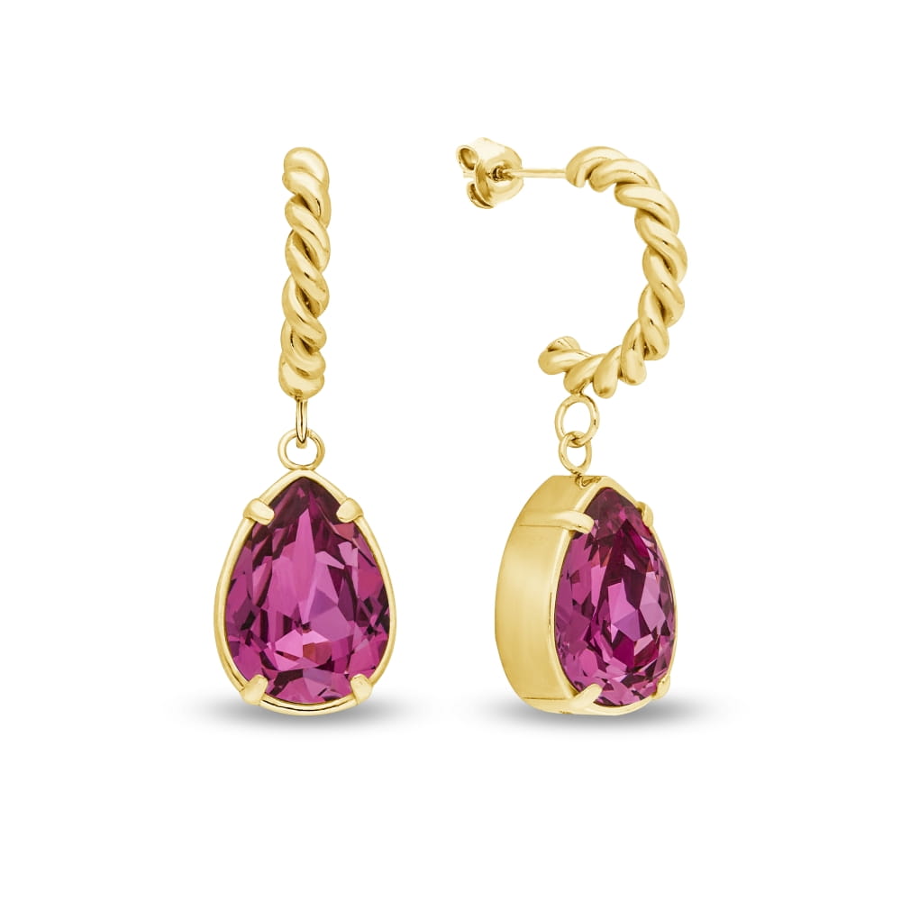 Kolczyki wykonane są ze stali szlachetnej w kolorze złota oraz kryształów Swarovskiego. Kryształ o wielkości 1,6 cm jest w kolorze amarantu. Kolczyki zapinane są na sztyft. Ich wielkość całkowita wynosi ok. 3,5 cm.