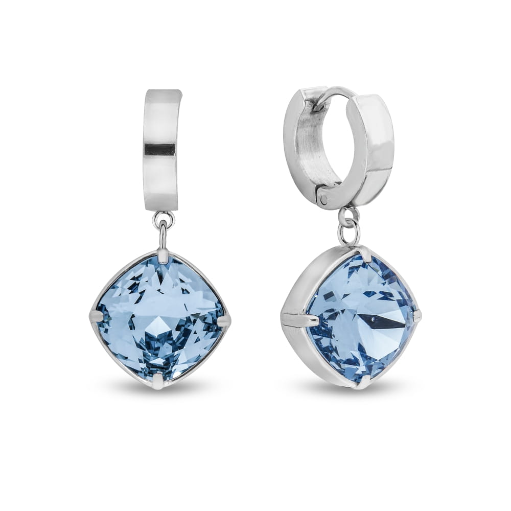 Kolczyki wykonane są ze stali szlachetnej w kolorze srebra oraz kryształów Swarovskiego. Kryształ o wielkości 1,5 cm jest w kolorze Aquamarine. Całkowita wielkość kolczyków wynosi ok. 3 cm.