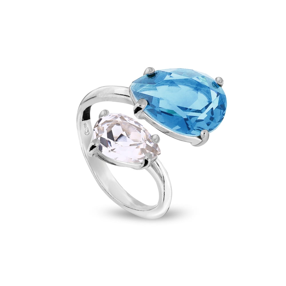 Pierścionek jest wykonany ze srebra próby 925 oraz kryształów austriackich w kolorach Crystal i Aquamarine.