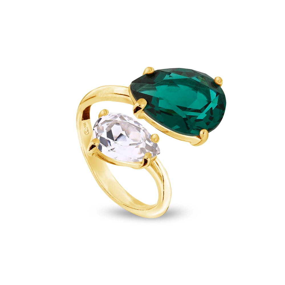 Pierścionek wykonany z pozłacanego srebra próby 925 oraz austriackich kryształów w kolorach Emerald i Crystal.